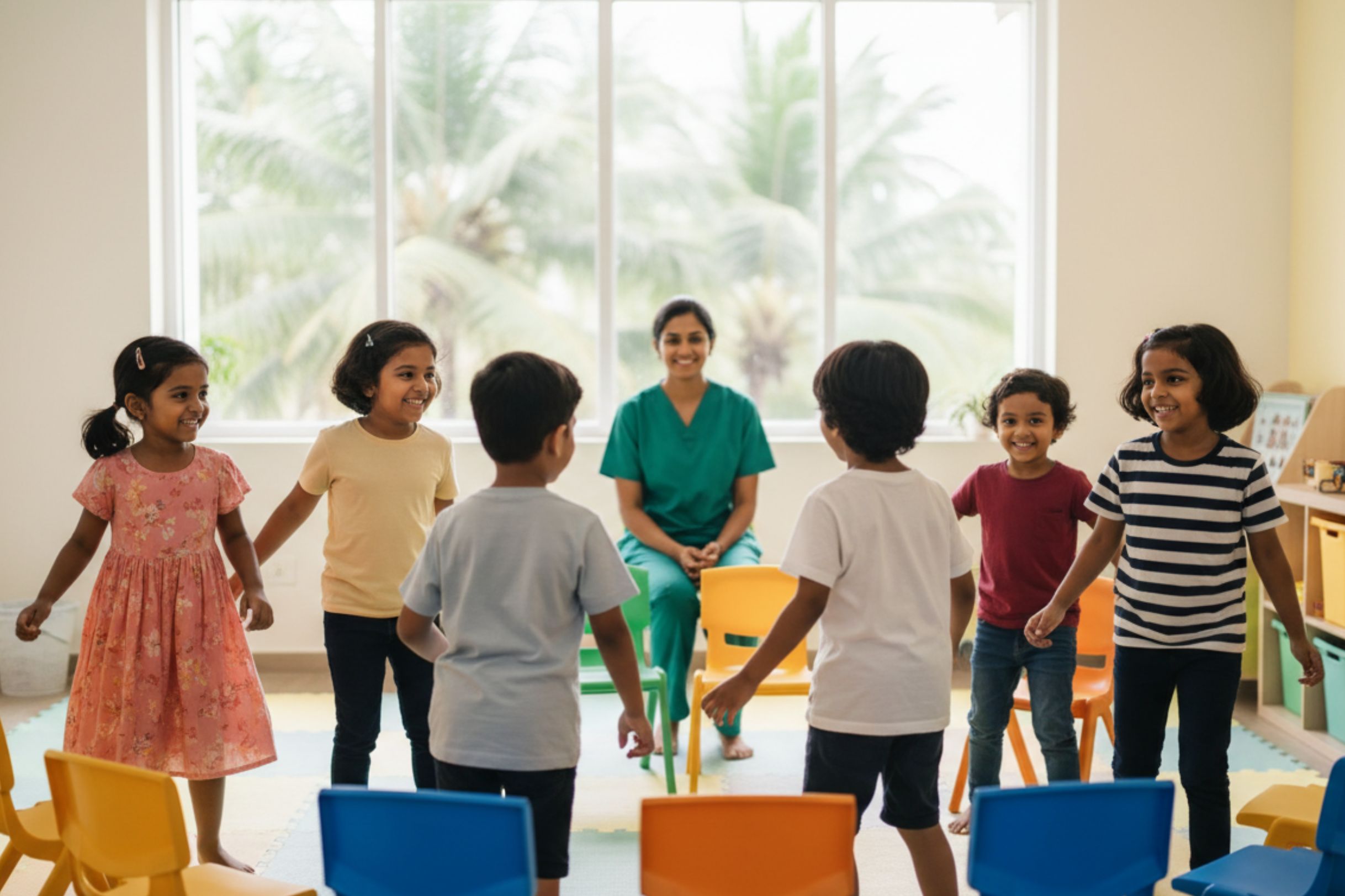 Nivera Child Development Center, Kochi, group therapy helps children improve social, communication, and emotional skills. Through peer interaction, guided activities, and play, kids gain confidence, teamwork, and positive behavior in a supportive environment.